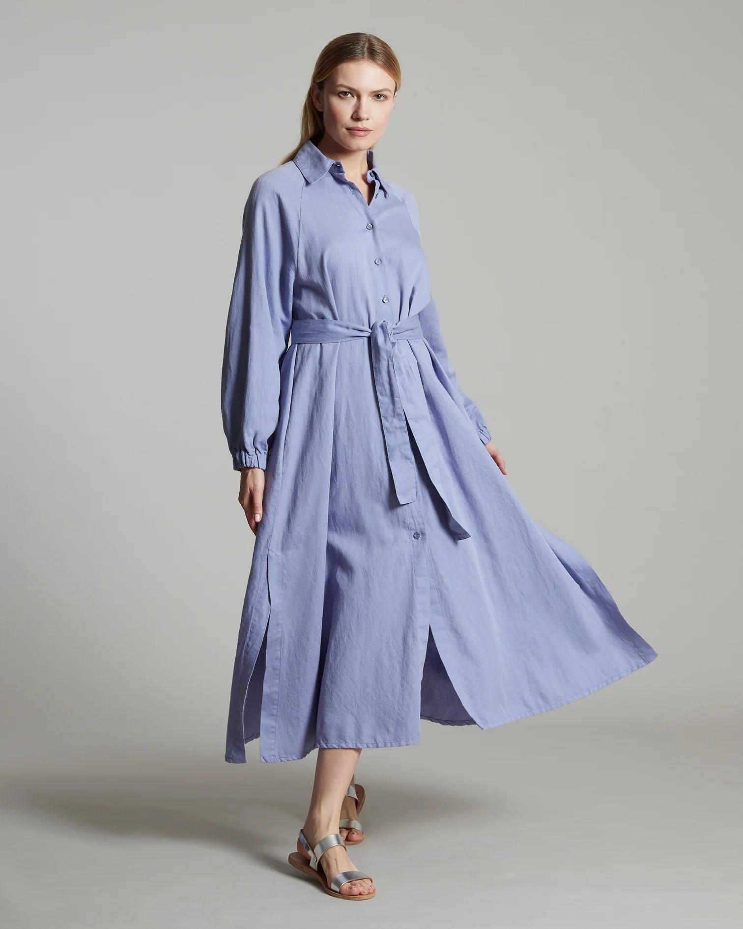 Chemisier dress reinterpreted in casual and feminine lines. The combination of the finest cotton and linen enhances the lightness and freshness of the garment. Versatile volumes grant comfort and elegance